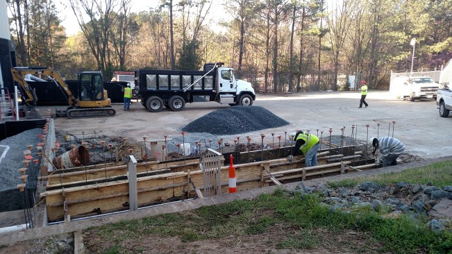 During the past week, a lot of concrete has been poured at the Michael Jordan Collision Center project in Durham, NC. Concrete has been placed for both walls and floors. Walls were formed and poured for the exterior front entry area and the interior vehicle access ramp.