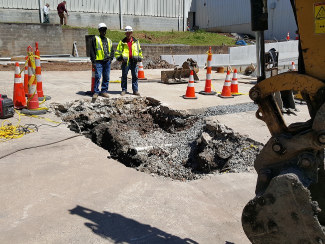 The surprise was the sudden appearance of a sink hole in the parking lot. Following installation of the oil-sand separator, and its subsequent tie-in to the existing sanitary sewer line under the parking lot, the trench as backfilled with washed stone and ready to be poured back. However, the next day, it was discovered that 1 to 1-1/2 tons of stone disappeared into a 6″ diameter hole in the trench bottom that had opened up sometime during the night. We investigated with camera work, and once weather permitted, excavated the area. We found that many years ago, the area had been backfilled with large rock. Over the years, the fines that had filled the void between the rocks had washed away by ground water. The void left behind easily swallowed the gravel once the weight of it overwhelmed the bottom of the new trench. Once excavated, the pipe was repaired and the hole was backfilled with washed stone. We pour it back this Saturday.