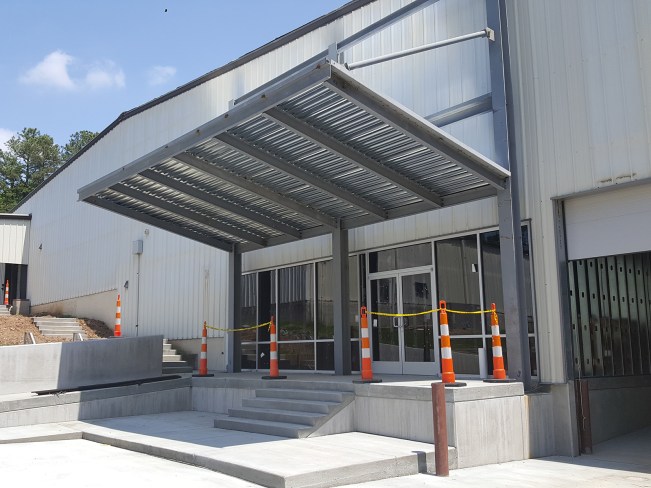 The front entry canopy steel went up this week for the Michael Jordan Collision Center project in Durham, NC. Schulz Ironworks from Raleigh threw up the canopy in 2-1/2 days with only the perforated metal sign panel left to be installed next week. The canopy is one of the finishing touches on the much upgraded entrance of this former warehouse building.
