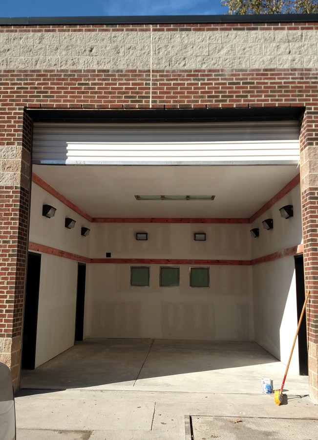 An existing storage bay was converted for use as a spray booth. An existing overhead door opening had to be enlarged substantially to accommodate the larger vehicles. A new non-combustible spray booth and chemical storage room were constructed within the existing building. New ventilation, lighting and power were also required.