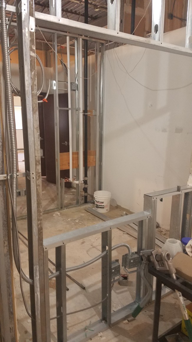 Metal stud framing, electrical and plumbing rough-ins are nearing completion. Inspections should be signed off early next week, allowing sheetrock hanging to begin in this suite.