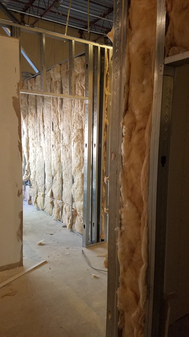 Rough-in inspections were signed off so sheetrock installation has begun. Sound batt insulation is installed between the metal stud framing. Mechanical and electrical rough-in continues overhead.