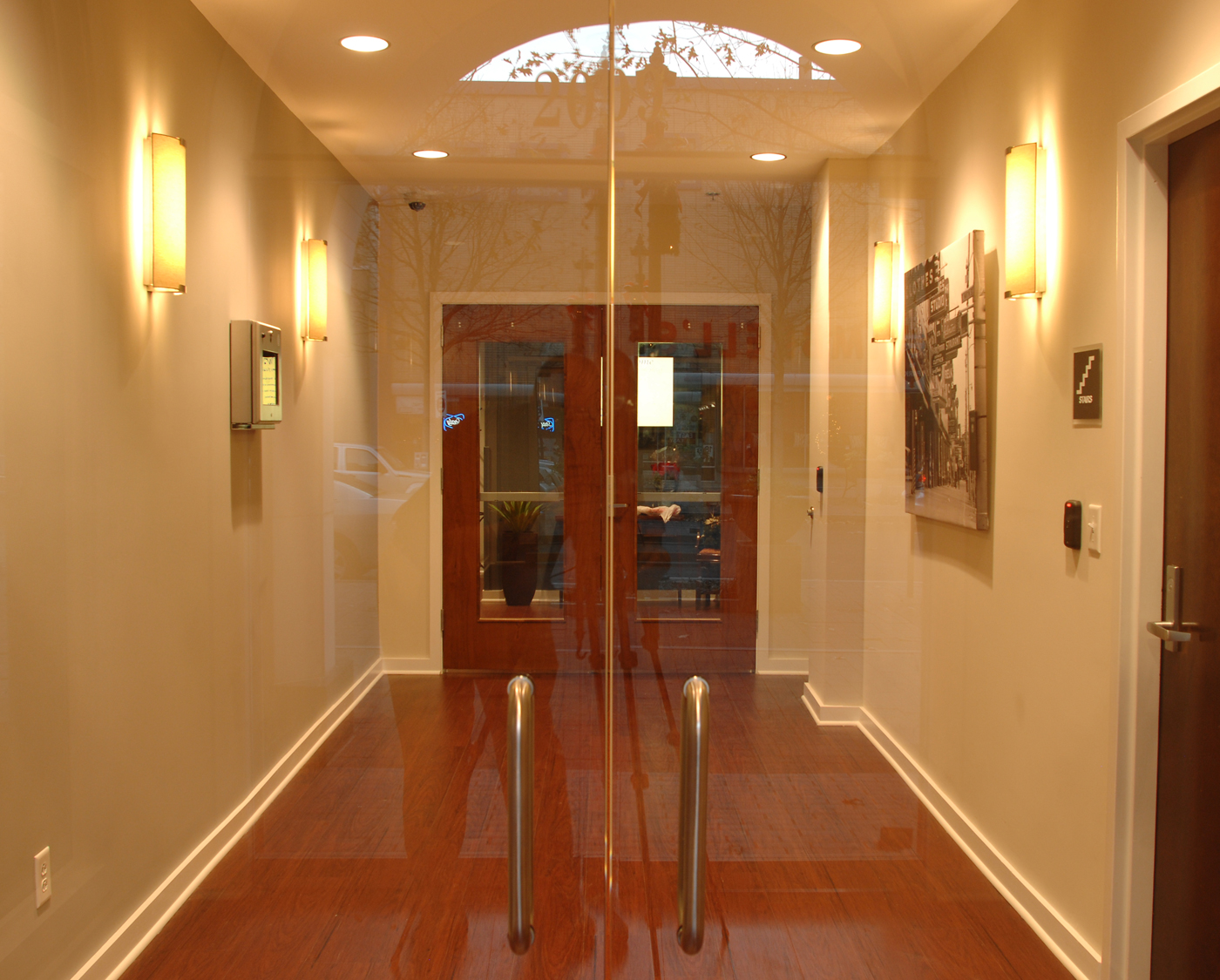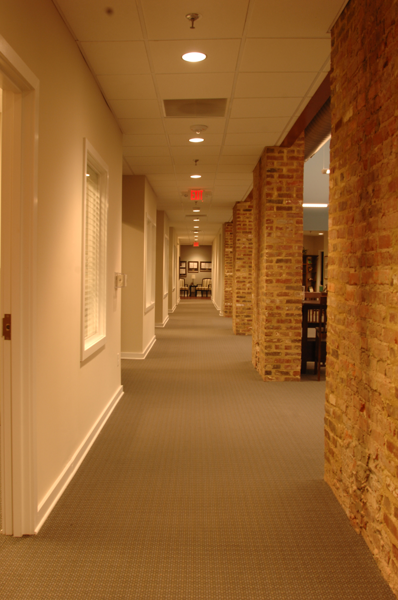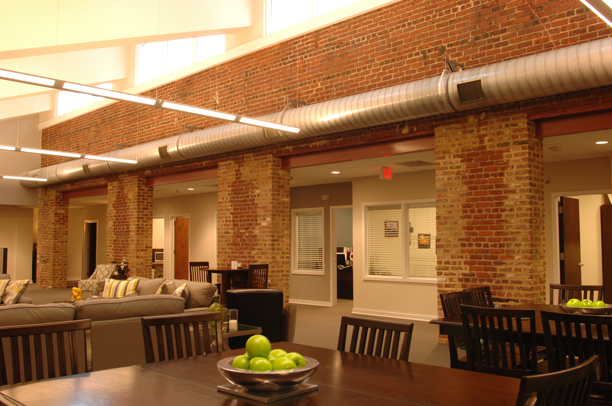 One happy surprise during construction was the discovery of some 16″ thick solid brick walls running through the building that had been covered over with gypsum board by the previous owner. Gontram Architecture and Ten Penny Construction convinced the Owner that not only did these brick walls require repair to remain structurally sound, but that they should be exposed for the buiolding occupants to enjoy.