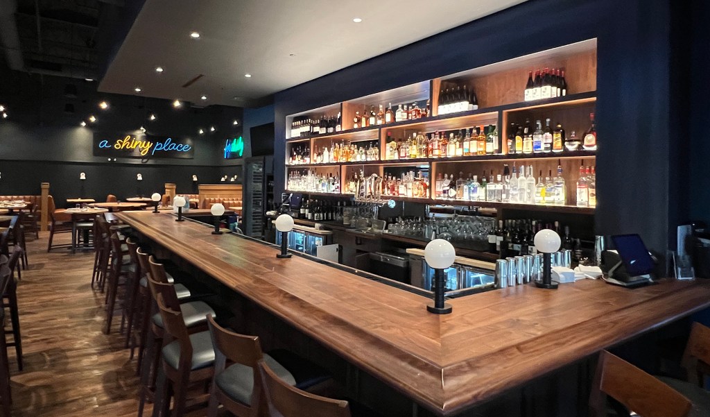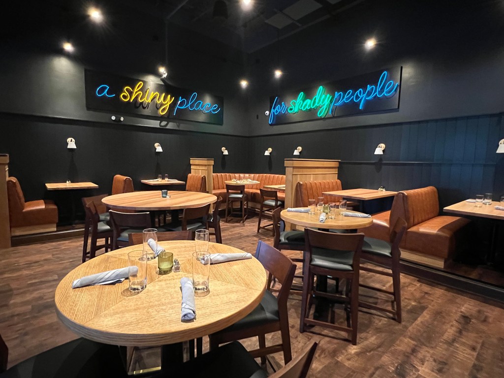 The restaurant dining area, bar and restrooms were fully gutted and revamped. Open ceilings now dominate the space! Some nostalgia has returned with “the mill” theme present in the decor, along with some new elements. A glass garage door provides better access to the gorgeous side patio. Restrooms are easily accessible (before, you almost had to go thru the kitchen to get to them). The bar entrance is still on the front and the dining entrance along the side, but both work for either function! It will be “A Shiny Place for Shady People!”